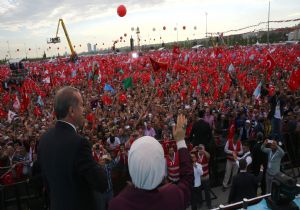 “Pensilvanya bizi asla kardeşlerimizin yanında olmaktan geri bırakamayacaksınız. Bu ülke son ezan susmadan, son bayrak inmeden, son ocak sönmeden amacınıza ulaşamayacaksınız” diyen Cumhurbaşkanı Recep Tayyip Erdoğan, “Boşuna Pensilvanya’daki sizi çok seven kuklanız üzerinden ‘mezar sizi bekliyor’ mesajları göndermeyin. Biz Allah’a inanmış insanlarız. Boşuna İstanbul’un fethine gönülden bağlı olmayı kompleks diye zillet diye aşağılamaya kalkmayın. Biz fetih ruhuna sahip çıkacağız. Bizim yattığımız toprak belli, tuttuğumuz bayrak belli. Onun için Rabiamız var. Nedir bizim Rabiamız? Tek millet, Türkü ile, Kürdü ile Lazı ile, Çerkezi ile Gürcü’sü ile Abaza’sıyla Boşnak’ı ile Romanı ile tek millet, tek bayrak” dedi.