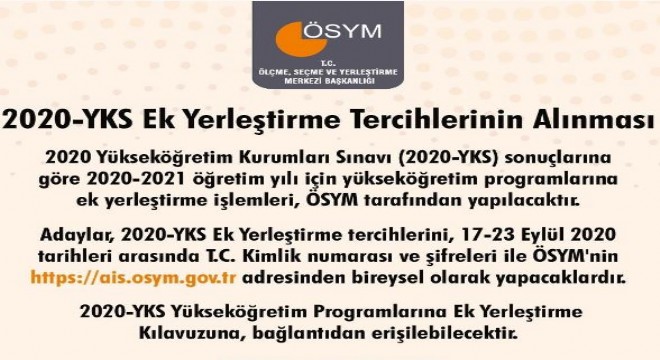 Adaylar, 2020-YKS Ek Yerleştirme Kılavuzu’na https://www.osym.gov.tr/TR,19512/2020-yks-ek-yerlestirme-kilavuz-ve-tablolar.html adresinden erişilebilecek.