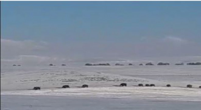 Kars’ın Akyaka ilçesine bağlı Küçükdurduran ve Sulakbahçe köylerinde sabah erken saatlerde ortaya çıkan domuz sürülerinin, koşarak karlı arazide ilerlediği görüldü. Domuz sürüleri Tokay Kurtbaş ve Mahsuncan Işık, tarafından cep telefonu kameralarıyla kaydedildi. Görüntülerde, kalabalık domuz sürüsünün karla arazilerde ve dağlık bölgede hızla kaçtığı anlar yer aldı.