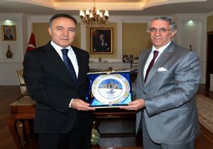 Vali Altıparmak ziyaret sonunda Arslan ve Demir’e hizmetleri anısına Erzurum logolu çini tabak hediye etti.