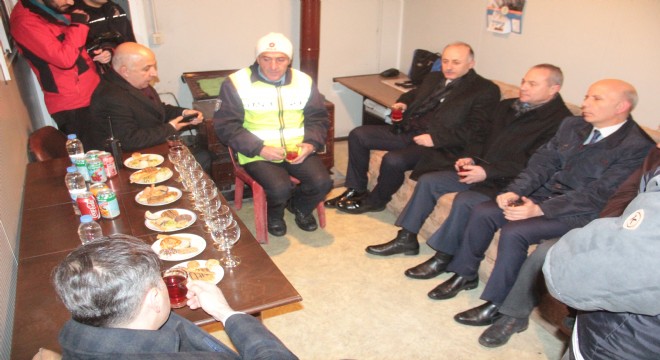 Vali Seyfettin Azizoğlu, beraberindeki İl Emniyet Müdürü Mehmet Aslan ve emniyet müdür yardımcılarıyla buz gibi havada nöbet tutan polisleri ziyaret etti. Erzurum-Artvin Karayolu üzerindeki uygulama noktasına çatkapı giden Vali Azizoğlu, polislere tatlı ikramında bulundu.