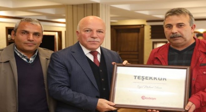 Türkiye Gazetesi Erzurum Bölge Sorumlusu Orhan Yılmaz Küçükdemir, Büyükşehir Belediye Başkanı Mehmet Sekmen’i makamında ziyaret etti. Başkan Sekmen’e “Teşekkür Belgesi” takdim eden Orhan Yılmaz Küçükdemir, “Başkanımıza önümüzdeki dönemde de başarılar diliyoruz. Erzurum’da belediyecilik anlamında çok güzel hizmetlere imza atan Başkanımıza çalışmalarından dolayı teşekkürlerimizi sunuyoruz” dedi.