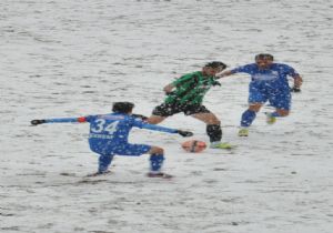 Yoğun kar yağışı altında Erzurum Büyükşehir Belediyespor’un cezası nedeniyle seyircisiz olarak oynanan maçta müsabakanın orta hakemi Caner Ak, zaman zaman maçı durdurarak silinen çizgilerin yenilenmesini istedi.