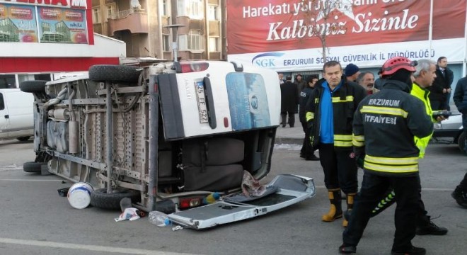 Edinilen bilgiye göre, Erzurum Yakutiye Belediyesi DGM kavşağında meydana gelen trafik kazasında Yoncalık Caddesi’nden Medrese Caddesine seyreden 25 FF 522 plakalı cezaevi personelini taşıyan servis minibüsü ile Tebrizkapı semtinden Cumhuriyet Caddesine seyreden 81 FB 027 plakalı sebze yüklü minibüs çarpıştı.