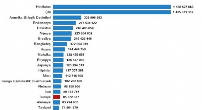 Türkiye, 85 milyon 372 bin 377 kişi nüfusu ile nüfus büyüklüğüne göre 194 ülke arasında 18. sırada yer alırken, dünya toplam nüfusunun yüzde 1,1'ini oluşturdu.