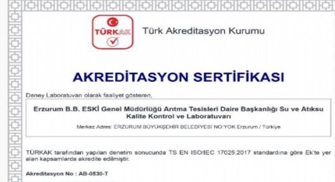 Büyükşehir Belediyesi Erzurum Su ve Kanalizasyon İdaresi (ESKİ) Genel Müdürlüğü’nün laboratuvarı uzun yıllardır Türk Akreditasyon Kurumu (TÜRKAK) tarafından akredite olmaya devam ediyor.