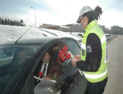 Erzurum’da trafik polisleri 14 Şubat Sevgililer Günü dolayısıyla sürücülere jest yaparak kırmızı karanfil dağıttı.