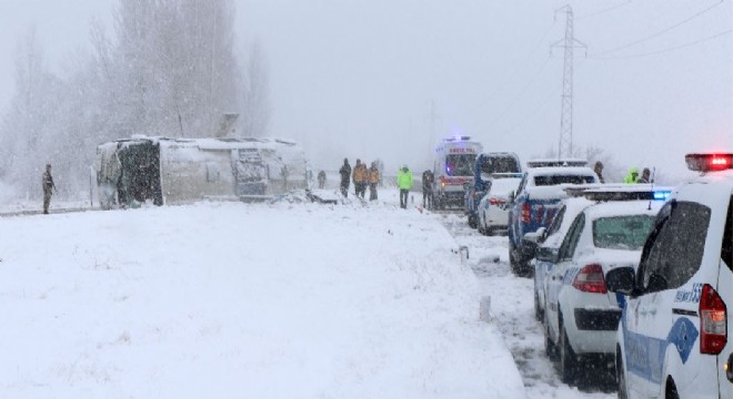 Kar ve tipinin etkili olduğu Erzincan’da buzlanan yolda sürücüsünün kontrolünden çıkan yolcu otobüsü yan yattı. Kazada 46 yolcu, yaralandı.
