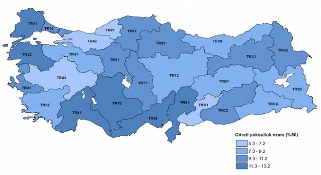 Her bölge için eşdeğer hanehalkı kullanılabilir fert medyan gelirinin yüzde 50’si temelinde hesaplanan yoksulluk sınırına göre, gelire dayalı göreli yoksulluk oranının en yüksek olduğu bölgeler; yüzde 13,2 ile TR61 (Antalya, Isparta, Burdur), yüzde 12,4 ile TR62 (Adana, Mersin) ve yüzde 12,3 ile TR22 (Balıkesir, Çanakkale) oldu. Göreli yoksulluk oranının en düşük olduğu bölgeler ise yüzde 5,3 ile TRC1 (Gaziantep, Adıyaman, Kilis), yüzde 5,7 ile TR81 (Zonguldak, Karabük, Bartın) ve yüzde 5,8 ile TR33 (Manisa, Afyon, Kütahya, Uşak) bölgeleri şeklinde sıralandı.