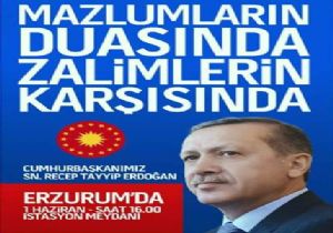 Cumhurbaşkanı Recep Tayyip Erdoğan 1 Haziran’da Erzurum’u teşrif edecek.  Cumhurbaşkanı Erdoğan 1 Haziran Pazartesi günü İstasyon meydanında halka seslenecek.‘Mazlumların Duasında, Zalimlerin Karşısında’ temalı etkinlik saat 16:00’da gerçekleştirilecek.