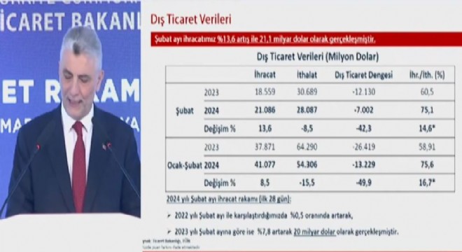 Ticaret Bakanı Ömer Bolat, “2024 Şubat ayı dış ticaret rakamlarına gelince, ihracatımız bir önceki yılın aynı ayına göre yüzde 13,6 oranında artarak 21 milyar 86 milyon dolar gerçekleşmiştir. Böylece Cumhuriyet tarihimizin en yüksek Şubat ayı ihracat değerine ulaştık. Şubat ayı itibarıyla son 12 aylık ihracat ise yüzde 1,6 oranında artışla 258,7 milyar dolar olarak gerçekleşerek 2023 yıl sonundaki tarihi rekor düzey bir kez daha aşılmıştır. İthalatımız ise Şubat ayında yüzde 8,5 oranında azalarak 28 milyar 87 milyon dolar gerçekleşmiştir. Dış ticaret açığının Şubat'ta geçen yılın aynı ayına göre yüzde 42,3 azalarak, 7 milyar dolara geriledi. İhracatın ithalatı karşılama oranı da 14,6 puan artışla yüzde 75,1'e yükseldi. Şubat sonunda yıllık olarak ihracatımızda 258,7 milyar dolara ulaştık. Aralık sonunda 255,8 milyar dolardı. İhracatçılarımız ilk 2 ayda ekstradan 3 milyar dolar ihracat başarısı gösterdi. Yıllıklandırılmış ithalatımız 351,8 milyar dolara geriledi" dedi.