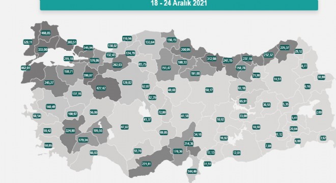 Sağlık Bakanlığı 18 -24 aralık verileri kaydında ülkede vaka sayısının en yüksek olduğu 10 il; Kırklareli 468,85, Çanakkale 462,01, Eskişehir 427,42, Tekirdağ 333, Edirne 329,11, Ordu 312,98, İstanbul 303,51, Bilecik 286,67, Giresun 247,15, Kocaeli 245,94 olarak kaydedildi.