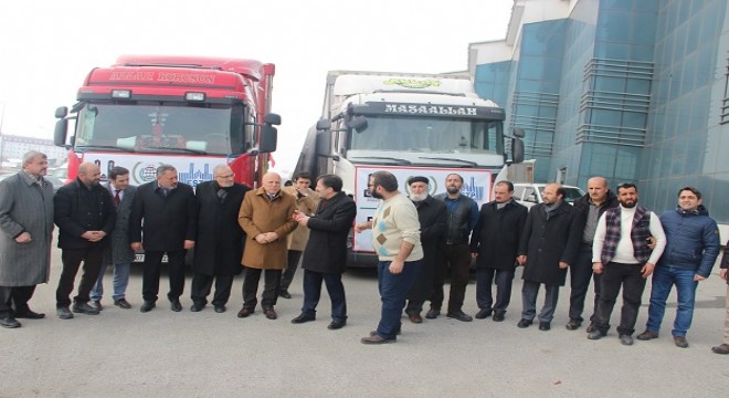 Kışlık giyecek, un, battaniye, ilaç, yiyecek ve yatakla yüklenen tırlar dualarla tampon bölgeye uğurlandı.
