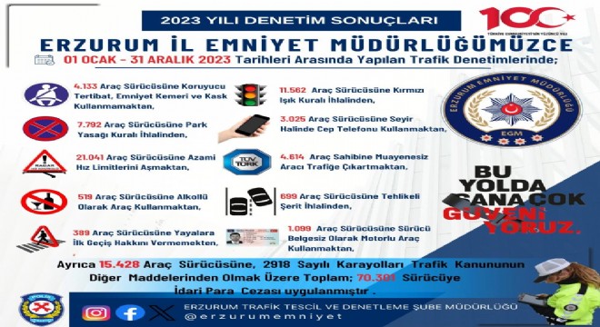 1 Ocak - 31 Aralık 2023 tarihleri arasında yapılan bir yıllık denetim ve çalışmalarda; Erzurum’da 4 bin 133 araç sürücüsüne koruyucu tertibat, emniyet kemeri ve kask kullanmamaktan, 7 bin 792 araç sürücüsüne park yasağı kuralı ihlalinden, 21 bin 41 araç sürücüsüne azami hız limitlerini aşmaktan, 519 araç sürücüsüne alkollü olarak araç kullanmaktan, 389 araç sürücüsüne yayalara ilk geçiş hakkını vermemekten, 11 bin 562 araç sürücüsüne kırmızı ışık kuralı ihlalinden, 3 bin 25 araç sürücüsüne seyir halinde cep telefonu kullanmaktan, 6 bin 614 araç sahibine muayenesiz aracı trafiğe çıkartmaktan, 699 araç sürücüsüne tehlikeli şerit ihlalinden ve bin 99 araç sürücüsüne sürücü belgesiz olarak motorlu araç kullanmaktan ceza yazıldı.