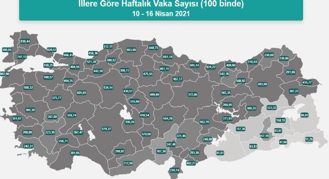 Sağlık Bakanlığı verilerine göre her yüz bin kişide tespit edilen vaka sayısı; Çanakkale 962,98, İstanbul 920,57, Yalova 838,25, Kırklareli 830,44, Tekirdağ 747,13, Kastamonu 683,09, Kocaeli 666,41, Giresun 624,22, Eskişehir 605,85, Samsun 601,14, Erzincan 593,35, Edirne 590,05, Konya 579,37, Bayburt 568,92, Balıkesir 566,32, Ordu 565,14, Malatya 563,79, Ankara 534,14, Düzce 521,38, Rize 516,03, Bartın 512,11, Kayseri 504,2, Bursa 500,57, Yozgat 499,89, Bilecik 494,25, Erzurum 493,09, Çorum 475,55, Tokat 467,17, Kilis 462,21, Amasya 461,11, Zonguldak 456,36, Bolu 442,18, Sinop 440,73, Kırıkkale 430,57, Iğdır 415,77, Nevşehir 410,54, Trabzon 409,9, Sakarya 404,55, Çankırı 399,11, Karabük 380,52, Kütahya 375,77, Sivas 372,86, Niğde 370,09, Isparta 367,47, Afyon 359,74, Aksaray 356,26, İzmir 351,97, Osmaniye 347,46, Kırşehir 315,99, Elazığ 311,93, Ağrı 307,23, Manisa 305,39, Antalya 301,65, Bingöl 300,25, Karaman 298,92, Gaziantep 293,36, Kars 291,66, Aydın 268,08, Tunceli 266,05, Burdur 258,71, Adıyaman 248,08, Gümüşhane 242,76, Muğla 242,31, Hatay 239,74, Ardahan 230,86, Artvin 230,09, Denizli 223,36, Kahramanmaraş 221,46, Mersin 213,56, Uşak 207,89, Adana 187,36, Batman 157,19, Bitlis 150,15, Muş 123,32, Diyarbakır 117,36, Mardin 93,83, Hakkari 91,26, Şanlıurfa 91,01, Van 89,01, Siirt 83,97, Şırnak 47,6 olarak kaydedildi.