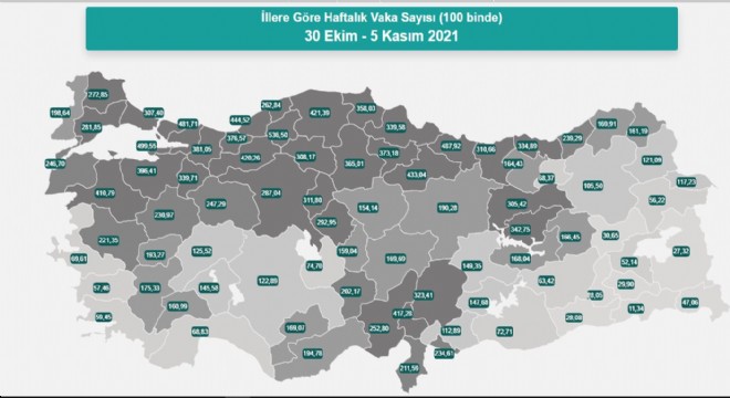 Türkiye’de vaka sayısının en yüksek olduğu 10 il açıklandı. Vaka sayısının 30 Ekim – 5 Kasım 2021 tarihleri arasında nüfusa oranla en yüksek olduğu iller Karabük 536,5, Yalova 499,55, Ordu 487,92, Kocaeli 481,71, Zonguldak 444,52, Tokat 433,04, Kastamonu 421,39, Bolu 420,26, Osmaniye 417,28, Balıkesir 410,79 olarak sıralandı.