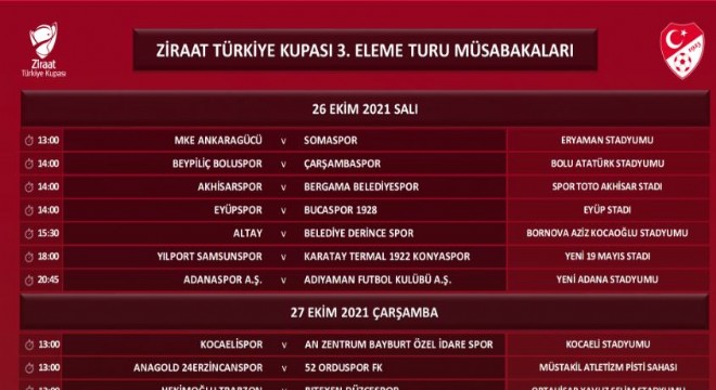 Ziraat Türkiye Kupası 3. Eleme Turu müsabakalarının programı açıklandı. Erzurumspor’un evinde çıkacağı Nazilli Belediyespor karşılaşması 27 ekim Çarşamba günü saat 15.30’da oynanacak. Menemenspor A.Ş. - Karşıyaka maçının hangi statta oynanacağı daha sonra ilan edilecek. Ziraat Türkiye Kupası maçları 26, 27 ve 28 Ekim tarihlerinde oynanacak.