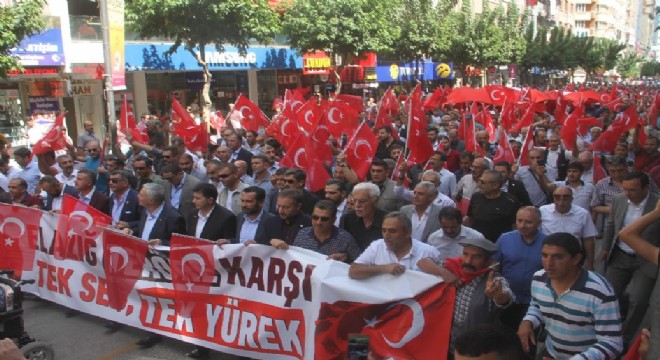Elazığ’da Sivil Toplum Kuruluşları öncülüğünde ‘teröre lanet’ yürüyüşü düzenledi. Bu kapsamda bayraklarını alan vatandaşlar 15 Temmuz Demokrasi Meydanı’nda bir araya geldi. Tekbirler getiren kalabalık, ‘Kahrolsun PKK, şehitler ölmez vatan bölünmez, Hacire anneler yalnız değil’ sloganları atarak Ahmet Aytar Meydanına kadar yürüdü.