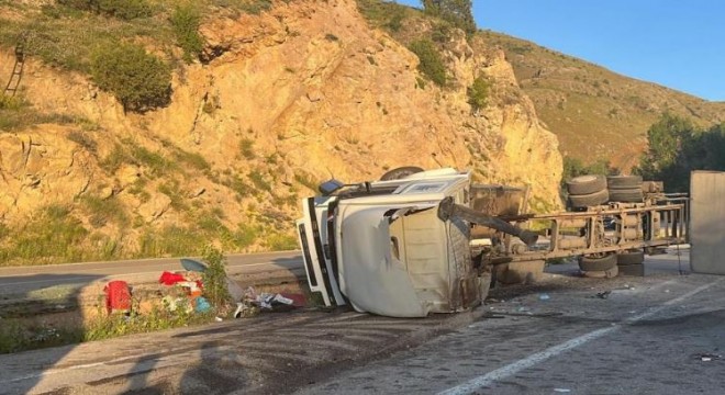 Gümüşhane’de sürücüsünün direksiyon hakimiyetini kaybetmesi sonucu başka bir otomobile çarpan gıda yüklü tır yan yattı, sürücü yaralandı.