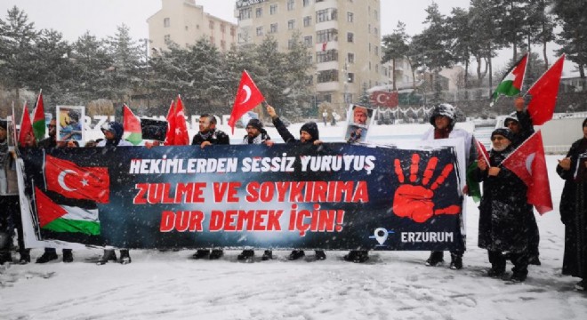 Erzurum’da yoğun kar yağışına rağmen Havuzbaşı Kent meydanında toplanan hekimler ve sağlık çalışanları, Filistin’de yaşanan drama dikkat çekerek İsrail’i kınadı.
