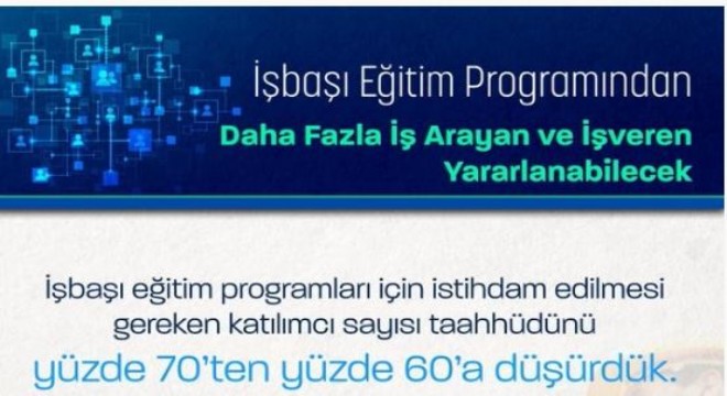 "İşbaşı Eğitim Programı"nda yeni bir düzenlemeyi hayata geçiriyoruz. İşbaşı eğitim programları için istihdam edilmesi gereken katılımcı sayısı taahhüdünü yüzde 70’ten yüzde 60’a, istihdam yükümlülüğünü 3 kattan 2 kata düşürerek iş arayan vatandaşlarımızın ve işverenlerimizin bu programlardan daha fazla yararlanmasının önünü açıyoruz. Ayrıca uygulanmakta olan sektör kısıtlamasını kaldırarak hizmetlerimizin yaygınlaşmasını sağlıyoruz.