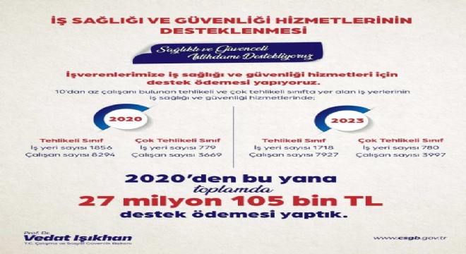 Çalışma ve Sosyal Güvenlik Bakanı Vedat Işıkhan, “Tehlikeli ve çok tehlikeli sınıfta yer alan iş yerlerinin iş sağlığı ve güvenliği hizmetleri için 2020’den bu yana toplamda 27 milyon 105 bin TL destek ödemesi yaptık” dedi.