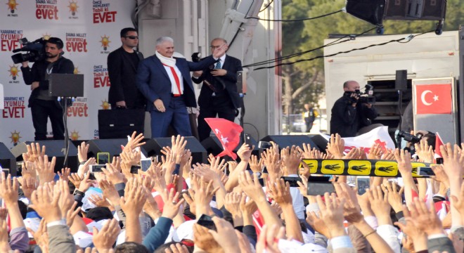 AK Parti Genel Başkanı ve Başbakan Binali Yıldırım, Cumhurbaşkanlığı hükümet sistemi halk oylaması süreci kapsamında Muğla’nın Menteşe ilçesi açık oto pazar yeri meydanında düzenlenen mitingde halka hitap etti. Başbakan Yıldırım, “Dünyanın her bir ilçesi dünyada bir marka. Dünyada bu güzelliklere sahip başka bir il yok. Sahil uzunluğu Türkiye’nin en fazla olan, turizmin başkenti Muğla’dır. Muğla insanı Ege insanı sevgi insanıdır. Gönül insanıdır. Muhabbet insanıdır. Turgutreis’i yetiştiren bu toprağın insanları elbette gönlü açık, ufku açıktır. Biz asırlar boyunca bu coğrafyada, her canı aziz bilen, her inanca her kültüre saygı gösteren bir millet olarak var oldu. Farklı düşünebiliriz, yaşayışımız farklı olabilir. Ama insana bakışımız birdir, insan yaratılmışların en üstünüdür. Yaradanı severiz, yaratandan ötürü. AK Parti olarak 14 yıldır insanı merkez aldı. İnsanı yücelt ki, devlet yücelsin diyerek bu aşkla çalıştık. Türkiye’nin kardeşliği için, birliği, beraberliği için gür sesleri ile Bitlisliler haykırdı. Avrupa değerleri diyen ama milletvekillerimize, bakanlarımıza kapıları kapatan, atları ile itleri ile oradaki gurbetçilerimizi, kardeşlerimizi darp eden Avrupa duy sesimizi. Biz 81 ilimizin tamamına yakınıyız, çünkü biz bu ülkeyle sevdalıyız. 80 milyonun tamamının derdini dert edinmiş bir siyaset anlayışına sahibiz. Çünkü biz Recep Tayyip Erdoğan’ın ekibiyiz. Doğusu ile Batısı ile bütün Türkiye’nin hizmetkarıyız. Neye inanırsanız inanını, nasıl yaşıyorsa, nasıl davranıyorsa o şekilde olsun. Biz hiçbir ayrım yapmadık, yapmayız. Herkese aynı mesafedeyiz. Türkiye ortak paydamız, ay yıldızlı bayrağımız 780 milyon metrekare toprağımız ortak değerimiz. Büyük bir ailenin hepimiz bir ferdiyiz. Hiçbir zaman Türkiye haritasını renklere ayırmadık. En iyi bunu Muğla bilir. Muğlalının yolları havalimanları, hastaneleri, üniversitesi bilir. İstanbul’a ne yaptıysak Muğla’da daha fazlasını yaptık. Türkiye’nin dört bir köşesinde vatandaşlarımızı bağrımıza bastık. Bu yol milletin yoludur, bu yol sizin yolunuzdur” diye konuştu.