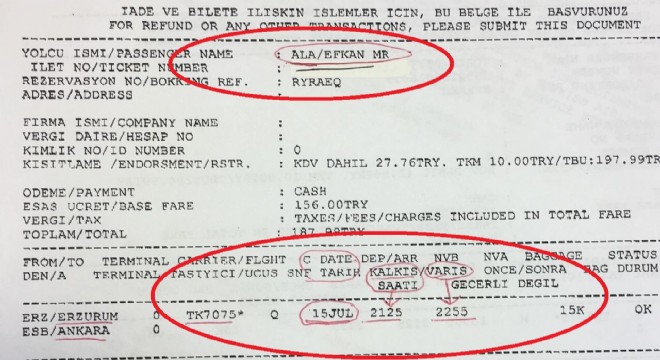 İçişleri Bakanlığı görevinden ayrılmasının hemen ardından bazı kesimlerin iftira kampanyası başlattığı Efkan Ala’nın 15 Temmuz gecesi iddia edildiği gibi “korkup, kaçmadığı”, “bir hangarda saklanmadığı”, “özel bir uçakla Gürcistan sınırında tur atmadığı” uçak bileti ispatlandı. Efkan Ala’nın darbe girişiminin başladığı saatlerde 21.25’de Erzurum’dan havalanan Erzurum-Ankara seferini yapan Türk Hava Yolları’na (THY) ait tarifeli uçakla Ankara’ya seyahat ettiğini ortaya koyan uçak bileti ortaya çıktı.