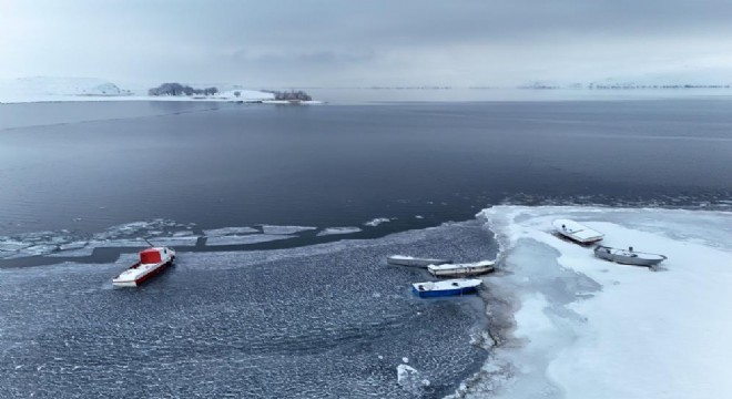 Nazik Gölü kısmen dondu, balıkçı tekneleri buzlar arasında kaldı