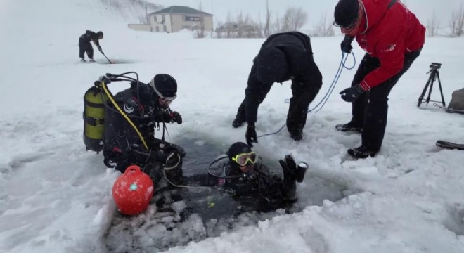 On beş dakika içeride kaldıklarını söyleyen Dalış eğitmeni Kadir Erekinci, “On dört nokta küsur. Derinlik olarak da on beş dakika içeride kaldım. Derinlik olarak da en derin yeri yedi buçuk metre Derinliğinde. burada derinlik çok önemli değil. Çünkü bizim altta işimiz yok. Buzun altı önemli ve bir giriş noktasından, diğer çıkış noktasına ulaşmak önemli. Bunun için alınan emniyetler sağ olsun elliler üç bin iki yüz firması bize bu konuda çok büyük destekler sağladı. Araba kurtarma ekibi. Arama kurtarma ekipleri bize destek burada. Yine belediyemizin ejder üç bin iki yüzün destekleri sayesinde bu gerçekleşti. Ama şunu da söylemek gerekiyor. Yani bu basit malzemelerle, basit daha önce dalış yapmış arkadaşların tecrübesiyle olacak şey değil. Üstelik tecrübe ve üst seviye ekipman gerektiren Bir dalış çeşidi. Tabii irtifada dalış yapıyoruz. Bu ayrı bir ekstra. Hem de buz altına da alıyoruz. Bu da ayrı bir ekstra” şeklinde konuştu.