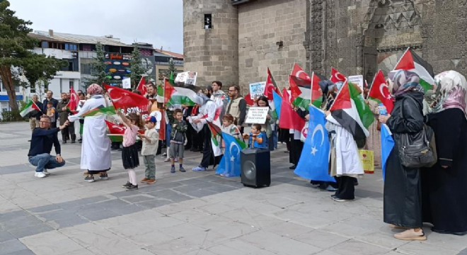 Kent merkezindeki tarihi Lalapaşa Camisi'nin önünde bir araya gelen hekimler ve sağlık çalışanları, Türk ve Filistin bayrakları eşliğinde taşıdıkları dövizler ve pankartlarla Yakutiye Medresesi'ne kadar yürüdü.