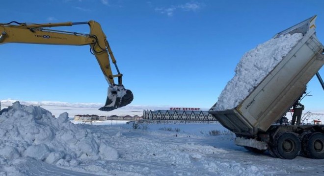 Kars İl Özel İdaresine bağlı ekipler, Handere köyü mevkisinden Cıbıltepe Kayak Merkezi'nin 1. etap oteller bölgesine kamyonlarla kar kütleleri taşıyor.