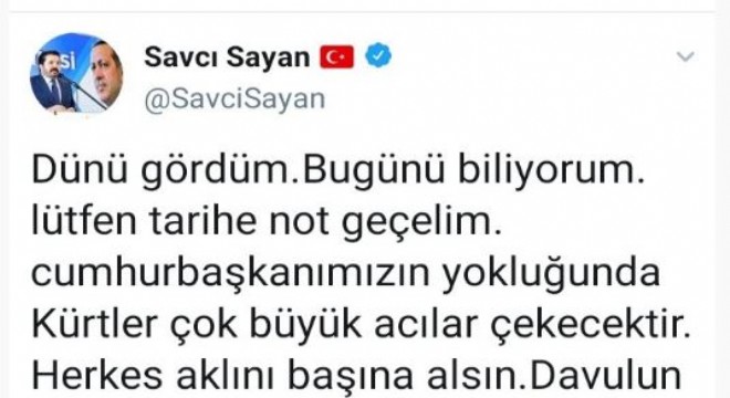 Sosyal medya hesabından dikkat çeken bir açıklama yapan Belediye Başkanı Savcı Sayan, "Dünü gördüm. Bugünü biliyorum. Lütfen tarihe not geçelim. Cumhurbaşkanımızın yokluğunda Kürtler çok büyük acılar çekecektir. Herkes aklını başına alsın. Davulun sesi uzaktan hoş gelir ama gerçekler hiç öyle değil. Dünü görenler bugünün kıymetini bilmelidirler. Son ahlar fayda etmez" dedi.