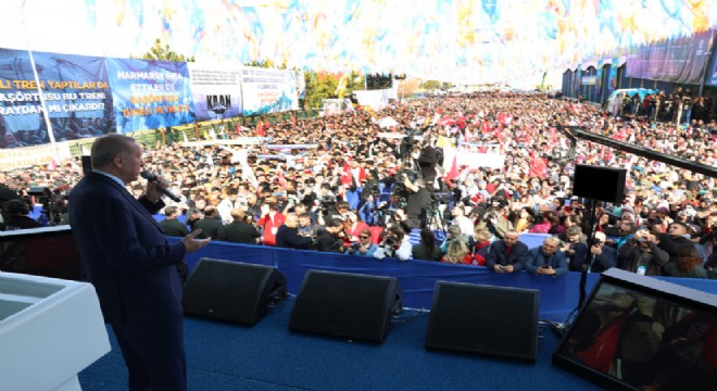 "Şimdi buradan, Millî Mücadele zaferinin ilk işaret fişeğinin atıldığı Kütahya'dan öyle bir ses verin ki, duymayan kalmasın" diyen Cumhurbaşkanı Erdoğan, "31 Mart'ta Türkiye Yüzyılı şehirleri için hazır mıyız? 31 Mart'ta Türkiye Yüzyılı şehirleri için kararlı mıyız? 31 Mart'ta gerçek belediyeciliği tercih ediyor muyuz? Bunun için seçim gününe kadar kapı kapı dolaşmaya var mıyız? Kütahya'yla birlikte Türkiye haritasının tamamını Cumhur İttifakı'nın renkleriyle boyamaya var mıyız?" dedi.