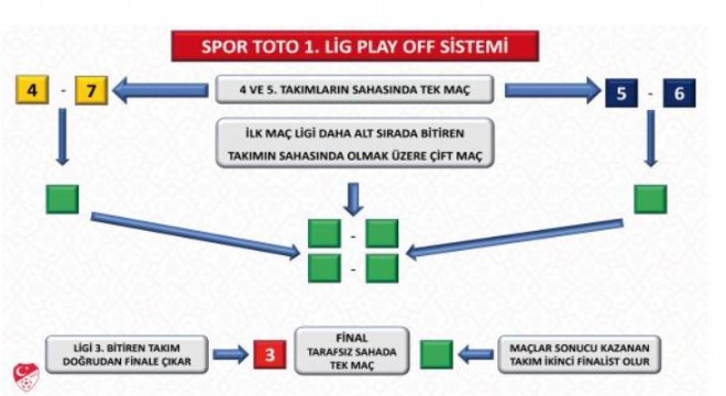 Sezon sonunda ligi ilk iki sırada bitiren takımların doğrudan Spor Toto Süper Lig'e yükseleceği Spor Toto 1. Lig'de Play-Off Sistemi şu şekilde uygulanacak: