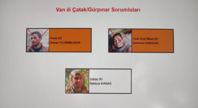 Açıklamada, “Etkisiz hale getirilen teröristlerden birinin Van Çatak ilçesinde sözde sorumlu seviyede faaliyet yürüten ve Terör Arananlar Listesi'nde 1 milyon TL’ye kadar ödülle Turuncu kategoride yer alan, Argeş kod adlı Osman Yıldırımçakar adındaki terörist olduğu, diğer teröristin de Van ili Gürpınar ilçesinde sorumlu seviyede faaliyet yürüten ve Terör Arananlar Listesi'nde 1 milyon TL’ye kadar ödülle Turuncu kategoride aranan, Jiyan Eruh Miran kod adlı Şehmiran Karahan adındaki terörist olduğu tespit edilmiştir” ifadelerine yer verildi.