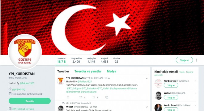 Daha önce YPG’nin sözde Genel Komutanı Sipan Hemo’nun sosyal medya hesabını ele geçirerek profil fotoğrafına Türk bayrağı yerleştiren Türk hackerlerdan bir şok da YPG’nin sözde kadın kolları YPJ’ye geldi. 4 binin üzerine takipçisi bulunan Twitter hesabını ele geçiren Türk hackerler, hesaptaki profilde Türk bayrağı açtı. Hesabın profil fotoğrafına Göztepe Spor Kulübünün armasını da koyan @Raiders1925 adlı hacker, YPJ’nin hesabından şehit Türk askerlerine Allah’tan rahmet dileyerek, “Türk vatanı uğruna can vermiş tüm şehitlerimize Allah rahmet eylesin” paylaşımında bulundu. Bu arada söz konusu hesabın örgüt içi yazışmalarına da ulaşıldığı, bu mesajların devletin ilgili kurumlarına bildirildiği öğrenildi.
