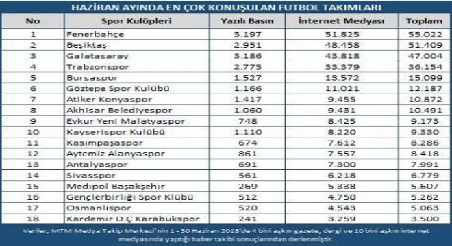 MTM, Türkiye Spor Yazarları Derneği için hazırladığı Haziran ayı medya raporunu açıkladı. Rapora göre, ay boyunca en çok konuşulan takım Fenerbahçe olurken, en çok konuşulan futbolcu ise Burak Yılmaz oldu. Geçtiğimiz sezon hareketli geçen Süper Lig yarışında galip gelen taraf Galatasaray olmuştu. Ligin bitmesiyle beraber futbol dünyası, transfer haberleri ile gündeme gelmeye başladı. 14 Haziran'da Rusya-Suudi Arabistan maçı ile başlayan 2018 FİFA Dünya Kupası da futbolseverlerin ilgi gösterdiği spor olaylarının başında geldi.