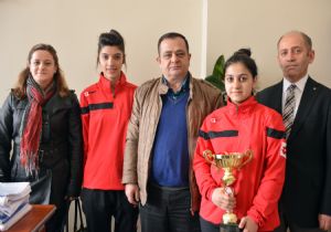 Gümüşhane'de kazandıkları gümüş kupayla teşekkür ziyaretine gelen Cumhuriyet Mesleki Teknik Anadolu Lisesi kız öğrencileri, öğretmen Elif Gürgen ve okul müdürleri Ayhan Akbulut, Yakutiye Spor Kulübü Başkanı Ferhat Mergan ile hatıra fotoğrafı çektirdiler.