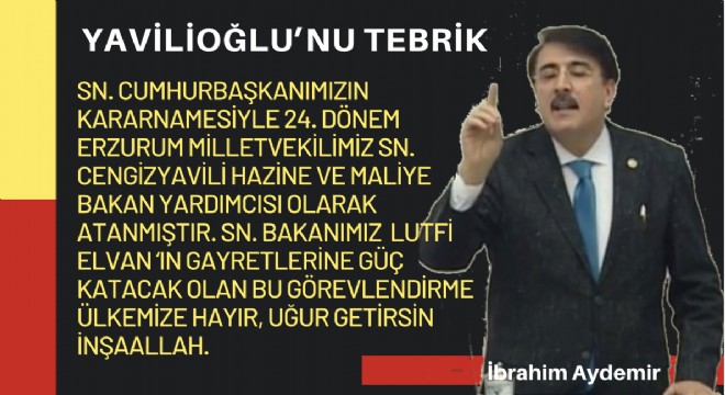 Atama sonrası bir açıklama yapan AK PARTİ Erzurum milletvekili ibrahim aydemir,Sn. Cumhurbaşkanımızın kararnamesiyle 24. Dönem Erzurum Milletvekilimiz Sn. Cengiz Yavilioğlu Hazine ve Maliye Bakan yardımcısı olarak atanmıştır. Sn. Bakanımız Lütfi Elvan ‘ın gayretlerine güç katacak olan bu görevlendirme ülkemize hayır, uğur getirsin inşaallah. Dedi.