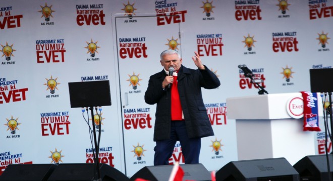 Başbakan Binali Yıldırım, "Sayın Kılıçdaroğlu komik duruma düşüyorsun. Yalanlarınla gülünç duruma düşüyorsun. Bir zahmet bu yalanları bırak da 18 maddelik değişikliği oku. Allah akıl fikir vermiş her gün sallıyor. Vitesi boşa atmış ha babam gidiyor. Bu değişiklikle rejim değişecek diyor. Kocaman bir yalan. Bu değişiklikle eyalet sistemi gelecek diyor. Bu da külliyen yalan. 4 milyon Suriyeliye vatandaşlık verilecek diyor. Bu da yalan. Erzurumlu Teyyo bunun yalanlarını duysa pataklar bunu" dedi.