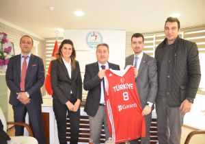 Erzurum Gençlik Hizmetleri ve Spor İl Müdürü Fuat Taşkesenligil’i ziyaret ederek organizasyon hakkında bilgi veren Türkiye Basketbol Federasyonu Yurtiçi Faaliyetleri Yöneticileri tüm Erzurumluları Kazım Karabekir ve Yakutiye Spor Salonu’ndaki etkinliklere davet etti. Basketbol İl Temsilcisi Semahattin Yıldız’nda hazır bulunduğu ziyarette, Serdar Çelik, Mana Tokatlı ve Tolga Yılmaz, Türkiye Basketbol Federasyonu 12 Dev Adam formasını GHSİM Müdürü Taşkesenligil’e hediye etti.