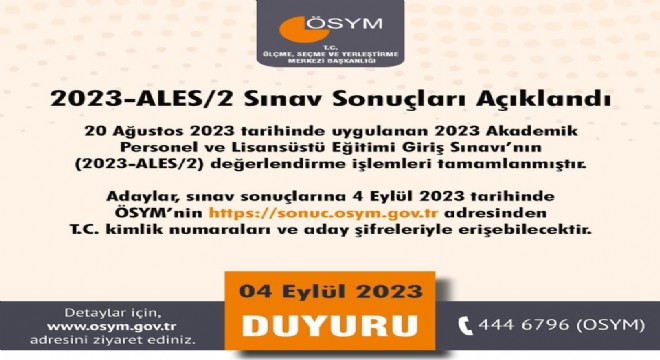 ÖSYM tarafından 20 Ağustos 2023 tarihinde uygulanan 2023 Akademik Personel ve Lisansüstü Eğitimi Giriş Sınavı (2023-ALES/2) sonuçları açıklandı. Adaylar, sınav sonuçlarına ÖSYM’nin https://sonuc.osym.gov.tr adresinden T.C. kimlik numaraları ve aday şifreleri ile erişebilecek.