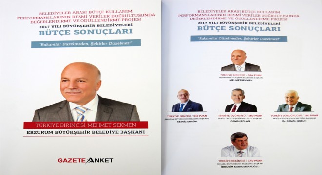 Erzurum Büyükşehir Belediye Başkanı Mehmet Sekmen de, Erzurumspor’da elde edilen başarıyı örnek göstererek, “Nasıl ki 3 yılda 3 kupa elde ederek Süper Lig’e çıktıysak işte bu güzel başarının ölçeğinde 3 yılda 3 kez yerel yönetimde de Türkiye Şampiyonu olduk” değerlendirmesinde bulundu. Başkan Sekmen, “Dadaşlardan aldığımız destek ve duayla Anadolu’nun zirve kentine hep ilkleri yaşadık. Hizmet aşk ve şevkimiz ilk günkü heyecanla artarak devam ediyor. Bizlere bu ödülü layık gören herkese teşekkür ediyorum” diye konuştu. Başkan Sekmen, sözlerini şöyle tamamladı: “Otuz Büyükşehir Belediyesi arasında birinci olmak kolay değil. Yatırım performansları ve yeni kaynaklar bulma performansı, tahsilat performansı, personel giderleri performansı ve harcama performansı dikkate alınarak kesin hesaplar incelenip söz konusu sonuca varıldı. Erzurum Büyükşehir Belediyesi 2015’te birinci oldu. 2016’da da bu başarıyı ikinci kez elde ettik. Ve 2017’de yine Türkiye şampiyonu olduk. Bütçemizin yüzde 67.18’ini şehrimizin inşa ve ihyası için yatırımlara ayırarak bu başarıya ulaştık. Erzurum Büyükşehir Belediyesi güçlü ekibi sayesinde üçüncü kez Türkiye’nin en başarılı yerel yönetimi seçildi. Bu başarı sadece Büyükşehir’in değil Erzurum’un da başarısıdır.”