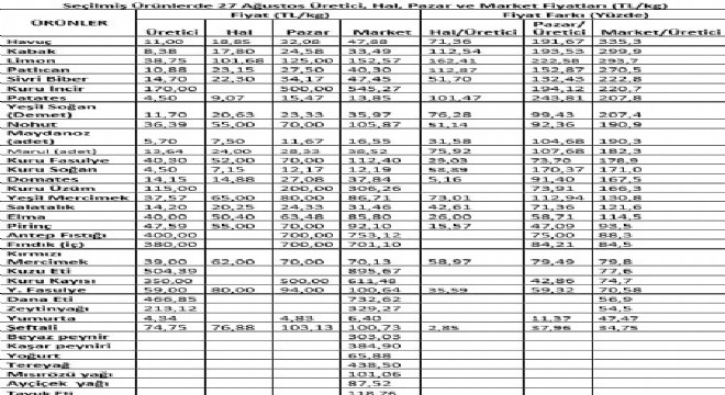 Ağustosta marketteki ürünlerin fiyat farklarına da değinen Bayraktar, "Ağustos ayında üretici ve market arasındaki fiyat farkı en fazla yüzde 335,3 ile havuçta görüldü. Havuçtaki fiyat farkını yüzde 299,9 ile kabak, yüzde 293,7 ile limon, yüzde 270,5 ile patlıcan, yüzde 222,8 ile sivri biber takip etti. Havuç 4,4 kat, kabak 4 kat, limon 3,9 kat, patlıcan 3,7 kat, sivri biber 3,2 kat fazlaya satıldı. Üreticide 11 lira olan havuç markette 47 lira 88 kuruşa, 8 lira 38 kuruş olan kabak 33 lira 49 kuruşa, 38 lira 75 kuruş olan limon 152 lira 57 kuruşa, 10 lira 88 kuruş olan patlıcan 40 lira 30 kuruşa ve 14 lira 70 kuruş olan sivri biber 47 lira 45 kuruşa satıldı. Ağustos ayında fiyatı en fazla artan ürün markette ve üreticide yeşil fasulye olurken, fiyatı en fazla düşen ürün markette kuru soğan, üreticide ise limon oldu" şeklinde konuştu.