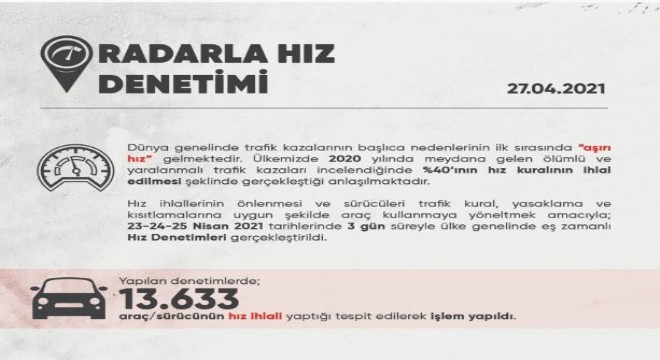 Emniyet Genel Müdürlüğü, trafikte can kaybının önüne geçmek ve sürücüleri kurallara uygun şekilde araç kullanmaya yöneltmek amacıyla 23- 25 Nisan tarihleri arasında yurt genelinde hız denetimleri gerçekleştirdiğini açıkladı. Yapılan denetimlerde hız ihlali yaptığı tespit edilen 13 bin 633 araç ile sürücüsü tespit edildi. Hız ihlali yapan araç ile sürücülere polis ekipleri tarafından cezai işlem yapıldı.