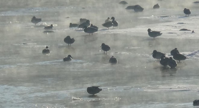Kars’ta aşırı soğuklardan dolayı büyük çoğunluğu tamamen donan Kars Çayı’nın açık kalan bölgeleri yaban ördeklerine ev sahipliği yapıyor.