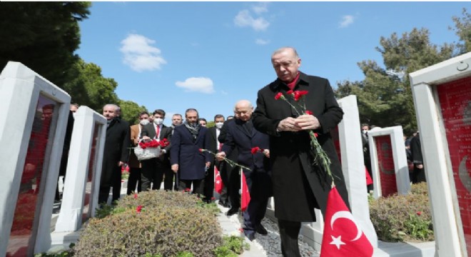 "Çanakkale geçilmez" sözünü tarihe nakşeden şehitleri rahmet, minnet, tazimle yâd ettiğini ifade eden Cumhurbaşkanı Erdoğan, "İstiklal Harbi'mizde, Kıbrıs Barış Harekâtı’nda, terörle mücadelede, 15 Temmuz'da vatanı için, bayrağı için canını feda eden güvenlik güçlerimize ve vatandaşlarımıza da bu vesileyle Allah'tan rahmet diliyorum. Allah onlardan razı olsun, ruhlarını şad, mekânlarını cennet eylesin. " dedi.