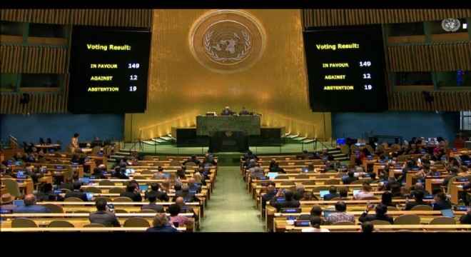 BM Genel Kurulu, Gazze’de derhal, kalıcı ve koşulsuz ateşkes çağrısında bulunan karar tasarısını, 149’a karşı 12 oyla kabul etti. Oylamada 19 ülke de çekimser oy kullandı.