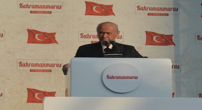 "28 Mayıs'ta Cumhurbaşkanı Recep Tayyip Erdoğan'ı 13. dönem cumhurbaşkanı yapmak mecburiyetindeyiz" diyen Bahçeli, "Bu oylar Kahramanmaraş'ta doruğa zirveye çıkmış, yüzde 71’e ulaşmıştır. Şimdi yeni bir seçimin tekrar arifesindeyiz. Aziz Kahramanmaraşlılar yüzde 71’den geri adım yok. Olmamalı. O sebepten dolayı sandığa nasıl gittiysek 28 Mayıs'ta tekrar gitmeliyiz. Sandıkta elimize alıp Sayın Recep Tayyip Erdoğan'a ve onu oluşturan Cumhur İttifakı partilerine oy verdiğiniz gibi bu kez iki aday üzerinde tek bir vuruşu Sayın Cumhurbaşkanımız Recep Tayyip Erdoğan'a yaparak 28 Mayıs'ta onu ikinci dönem, bir başka ifadeyle 13. dönem Cumhurbaşkanı yapmak mecburiyetindeyiz. Böyle bir çabaya söz veriyor muyuz? Sandığa gidiyor muyuz? Recep Tayyip Erdoğan diyor muyuz? 13. cumhurbaşkanını seçiyor muyuz? Öyleyse komşu bir ilin çocuğu olarak size bir şey söylüyorum. Adana'da çok konuşulur. Karada yüz, denizde yüz, havada yüz, ama 14 Mayıs'ta 71 noktayı geçmiş bir Kahramanmaraş için şimdi 28 Mayıs'ta Kahramanmaraş'ta yüz diyoruz. Söz mü? Havada, karada denizde olduğu gibi Türkiye'yi yeni bir yüzyılda yüzüncü yıl dönüm olarak kutlayacak mıyız?” şeklinde konuştu.